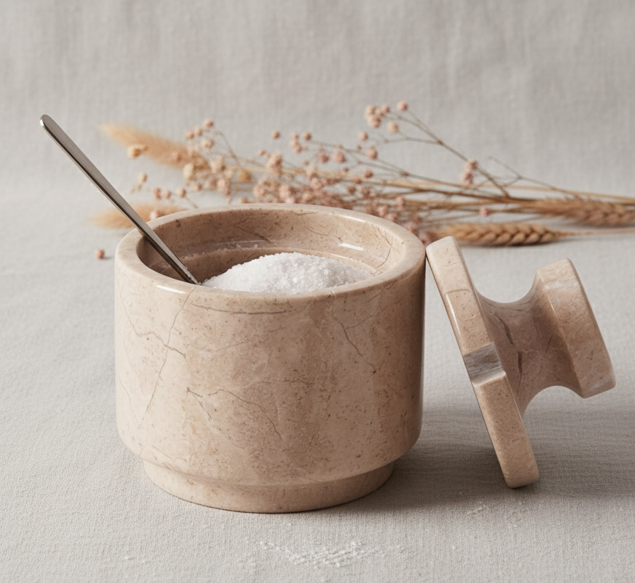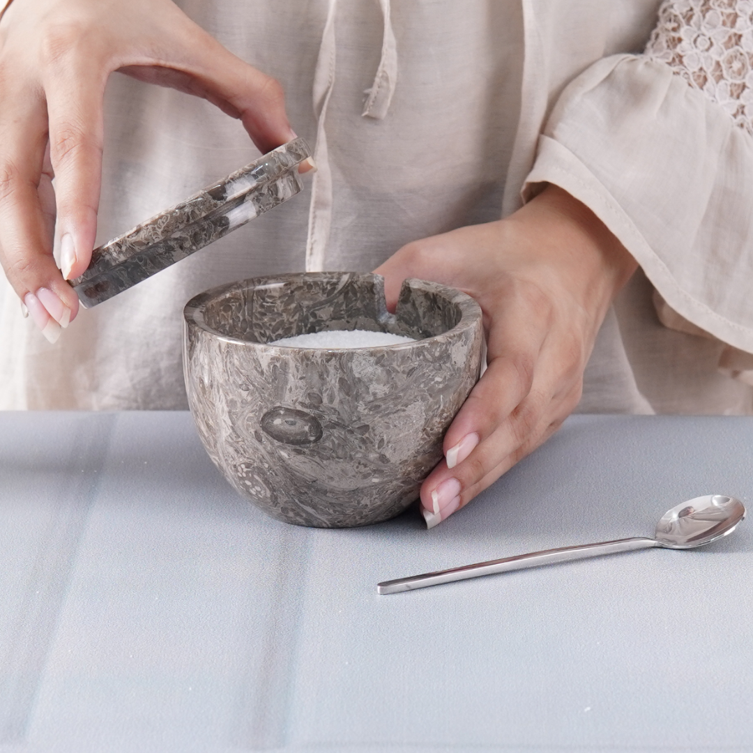 Very high quality container. Simple, handsome design. Small size, but the marble is thick and substantial.