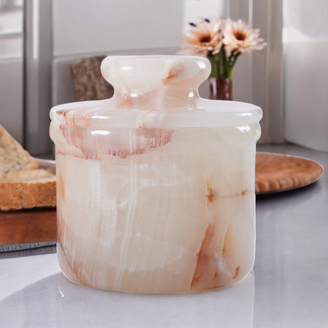 I bought this because I initially loved the color for the white onyx. I guess because of the stone, the color is going to vary because mine came and it looks white/opaque and no pretty rosy quartz markings (that was why I purchased it...I loved the slight pink hue in the photo). I has good weight on it and feel like a quality piece, but the butter does show through it slightly. This can hold about 4-5 oz of softened butter.