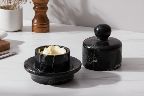 This butter keeper from Marblous Krafts is made of actual marble, helping to keep the butter cool and fresh. It’s heavy. It’s nicely and evenly carved. It’s a quality butter keeper; recommended.